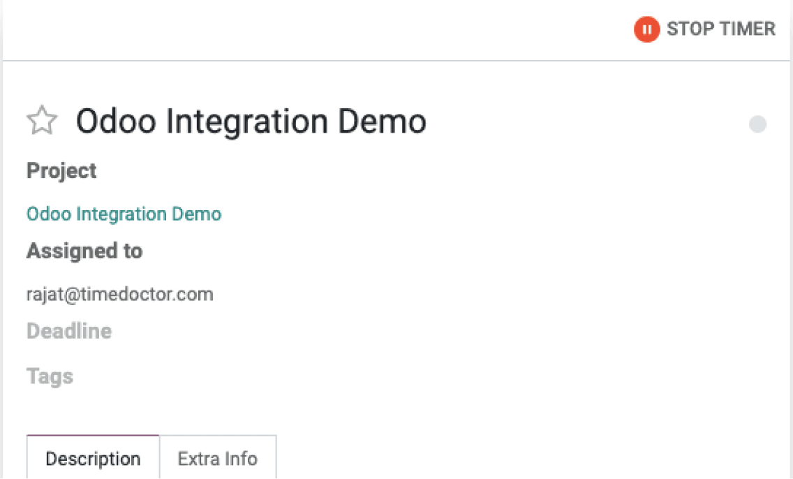 After set up, Time Doctor natively embeds itself in the Odoo interface. You will a "START TIMER" button along with each Odoo task to start time tracking for that task. Once you are done working on the task, simply click on the "STOP TIMER" button to stop time tracking for the task.