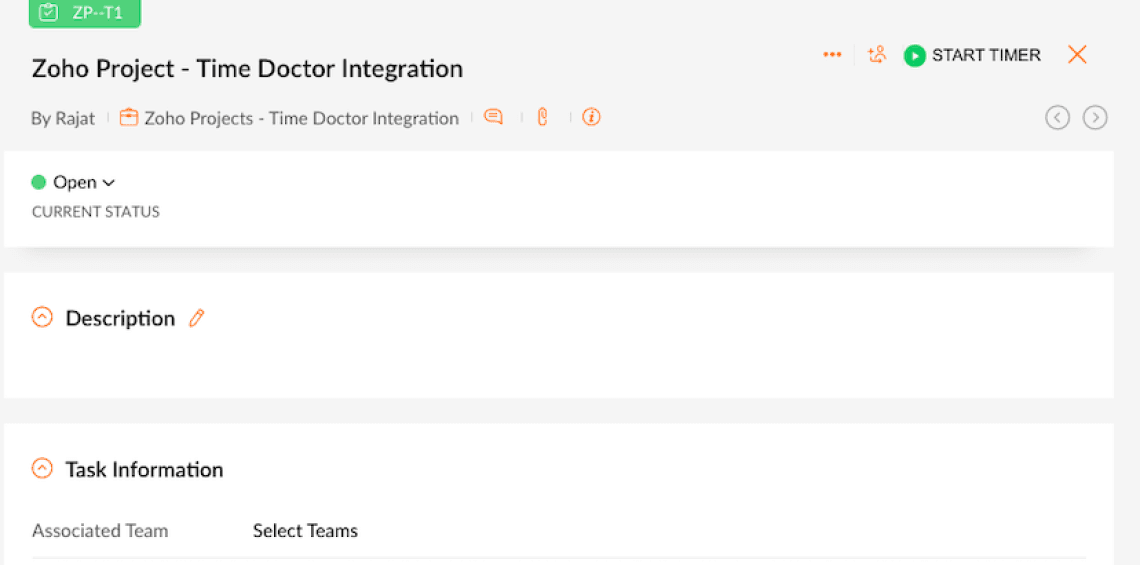 The integration makes time tracking seamless for your team by adding a Time Doctor start/stop timer button directly to Zoho Projects. The integration enables you to start a Time Doctor timer from individual tasks in Zoho Projects, so you don’t have to interrupt your workflow to track time.
