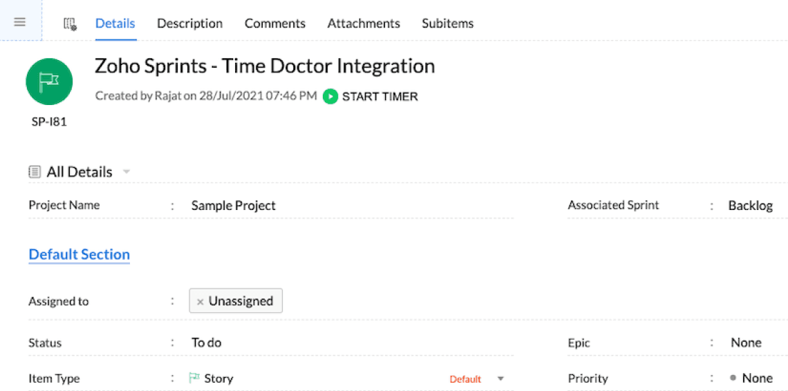 Once you install the Chrome extension and refresh the page, you’ll see a START TIMER button appear along with each task on Zoho Sprints. When you click on it, the button will automatically change to STOP TIMER. Once you are finished with the task, simply click on STOP TIMER and you’ll be all set.